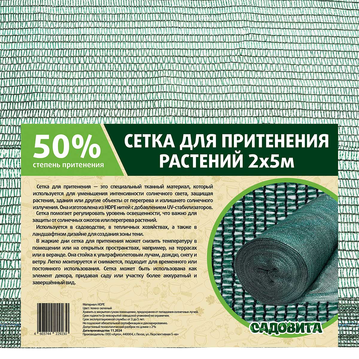 Сетка для притенения 2*5м 50% зеленая САДОВИТА